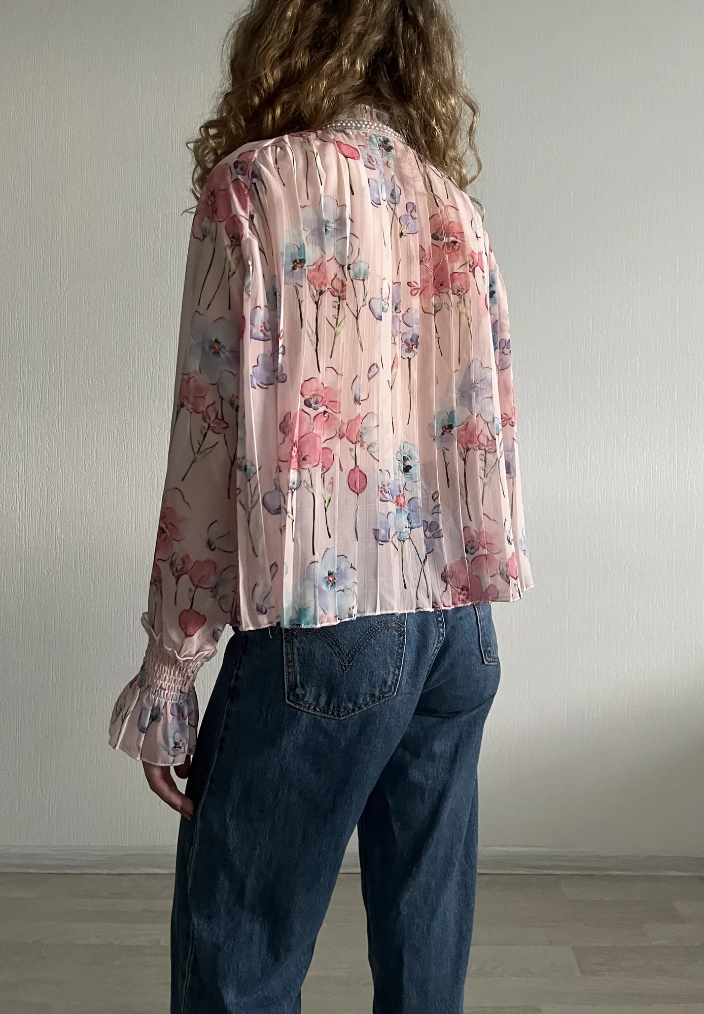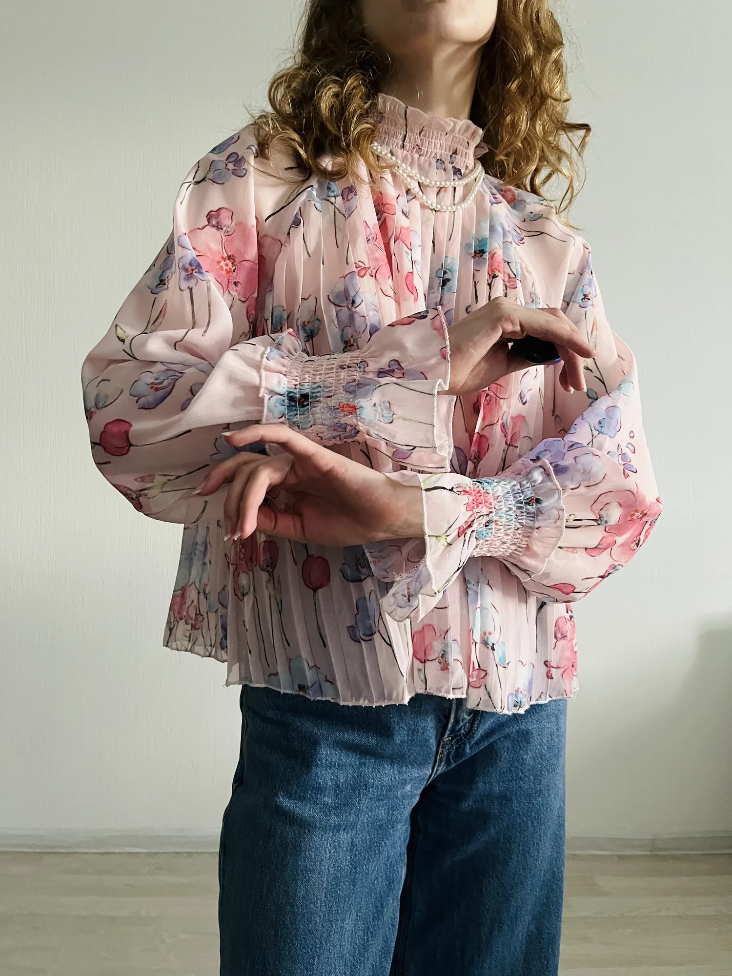 полупрозрачный топ с расклешенными рукавами и бантиком из страз